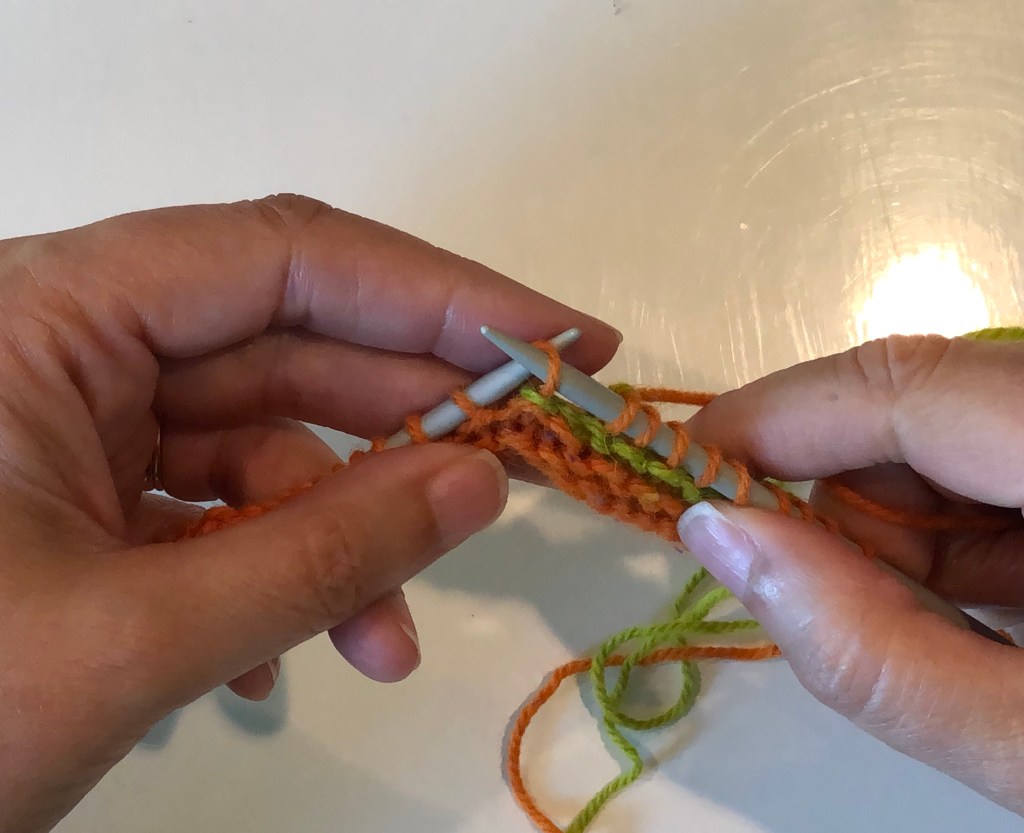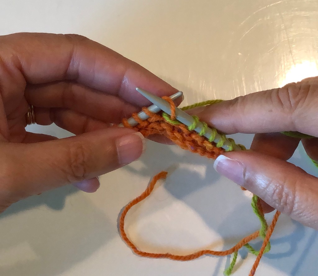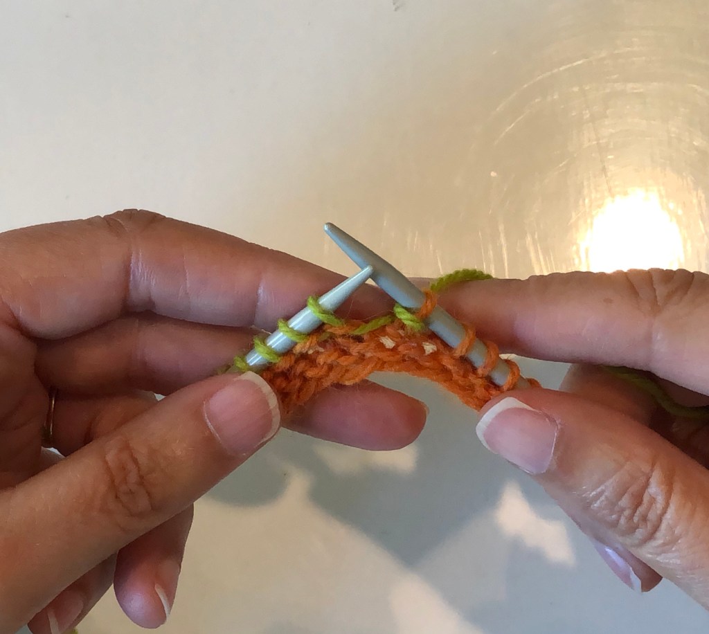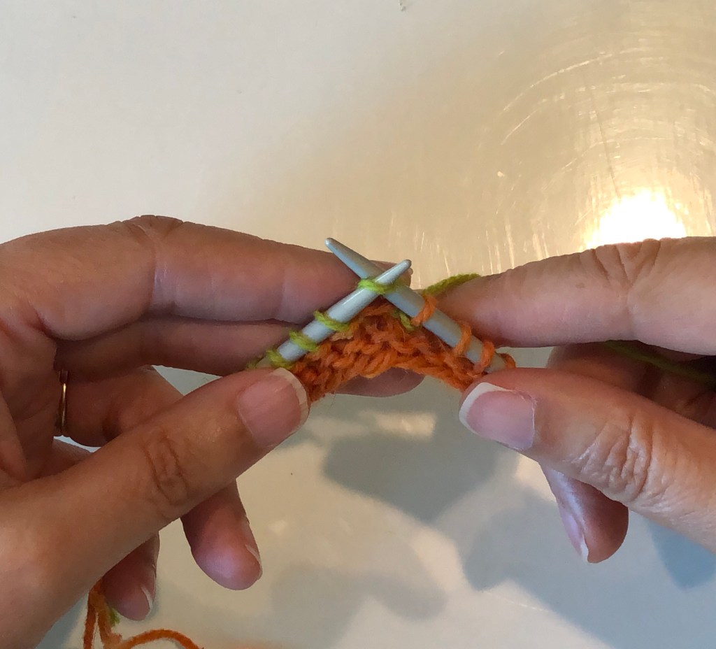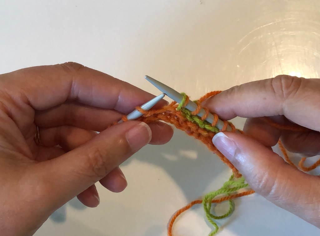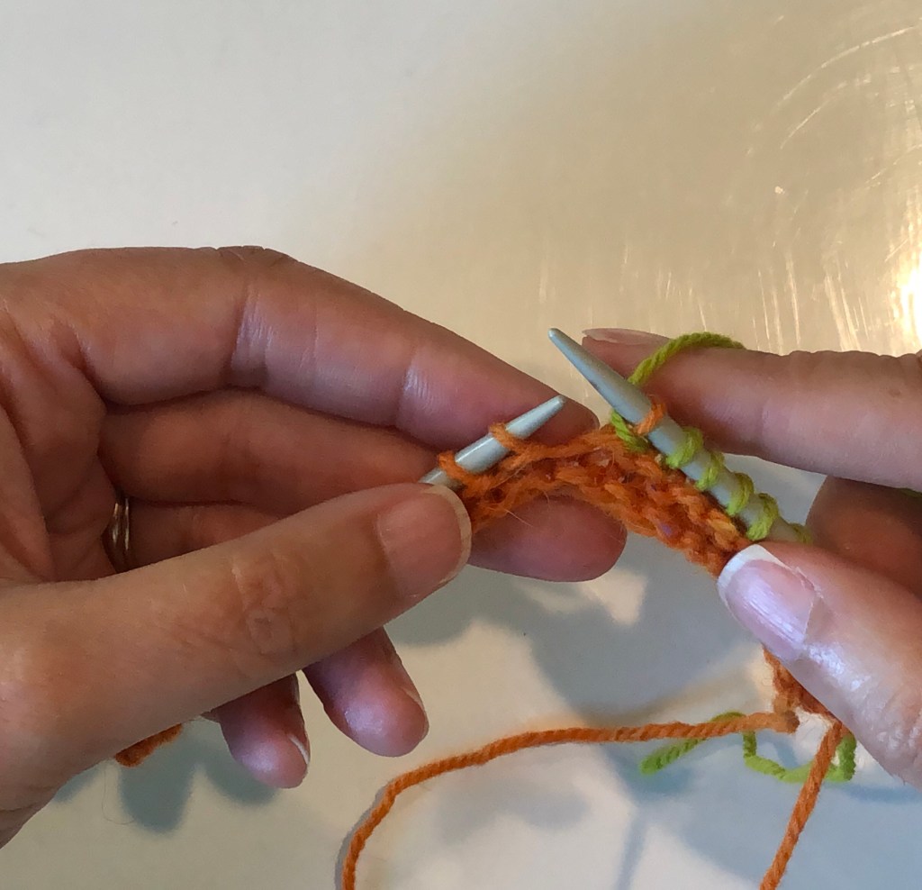 Work up to the wrapped stitch and slip this stitch (purl-wise) to the right hand needle.Pick up the wrap with the tip of the left-hand needle and place it over the slipped stitch.The wrap (green yarn) is over the slipped stitch (orange yarn).Move the slipped stitch and the wrap back to the left hand needle.