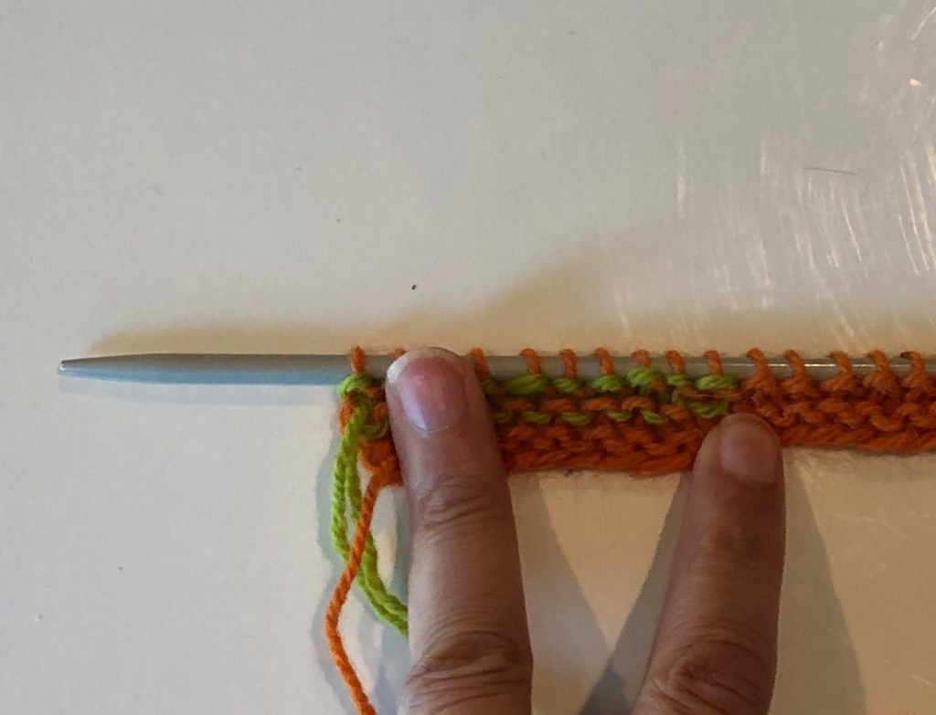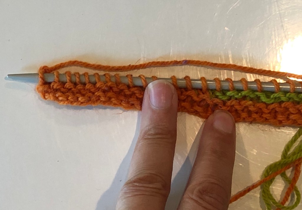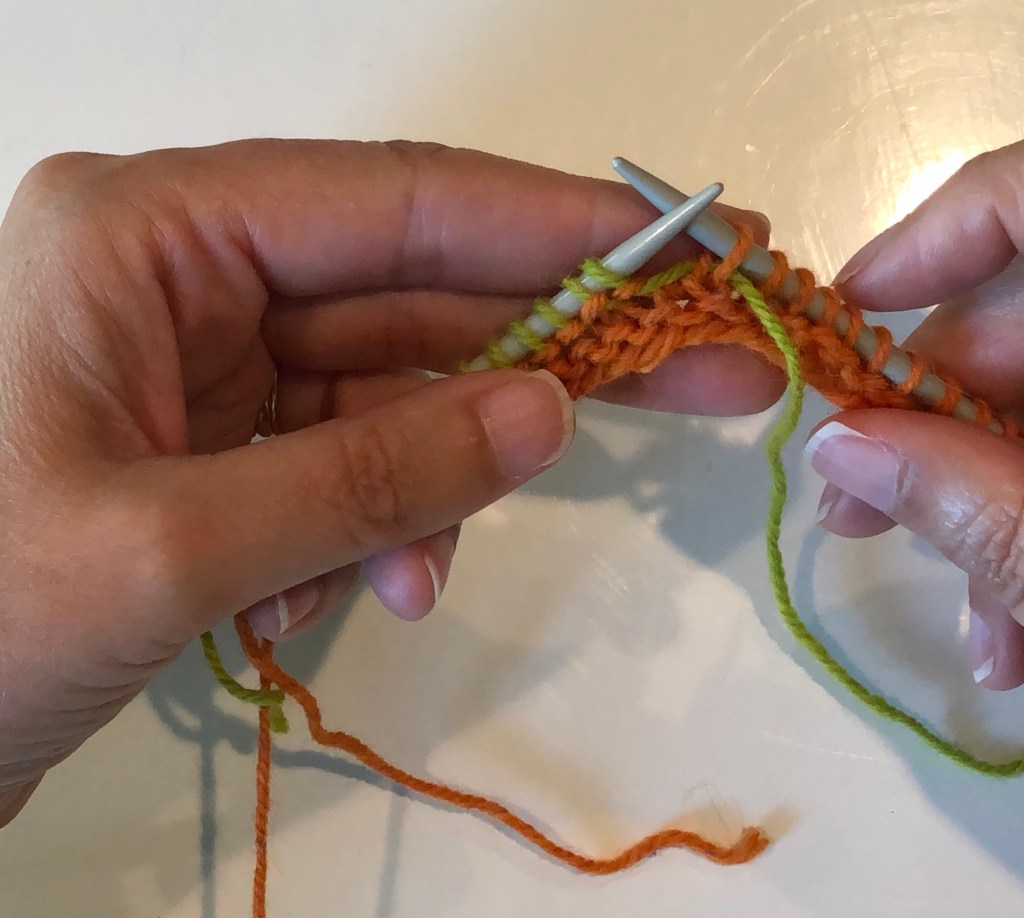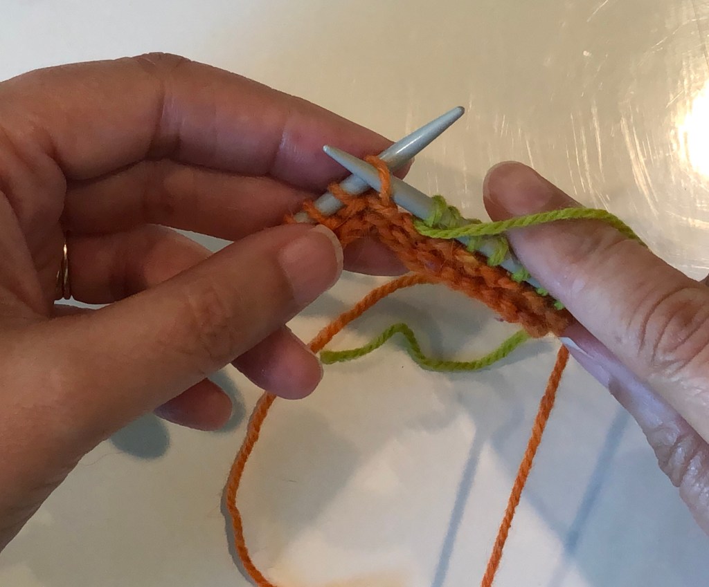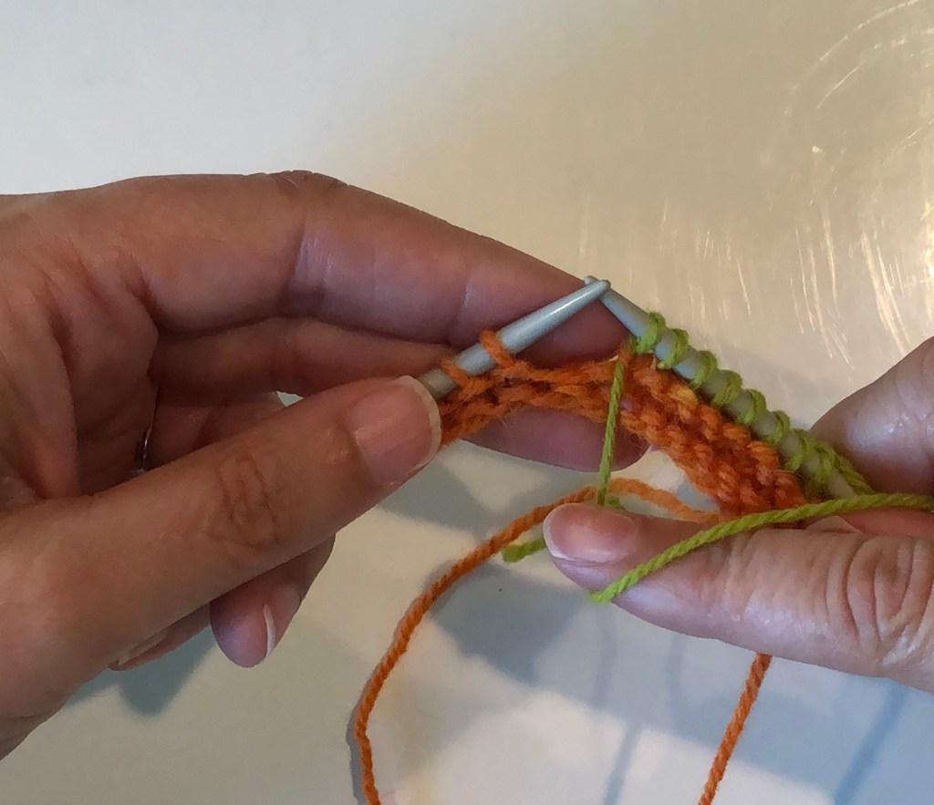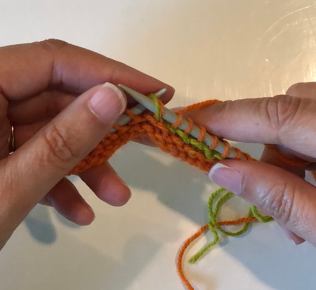 Work up to the wrapped stitch and slip this stitch (purl-wise) to the right hand needle.Pick up the wrap with the tip of the left-hand needle and place it over the slipped stitch.The wrap (green yarn) is over the slipped stitch (orange yarn).Move the slipped stitch and the wrap back to the left hand needle.