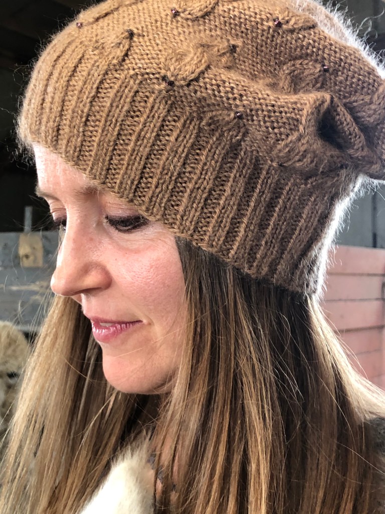 The hat is beaded and cabled, and constructed with two yarns held together. Super soft royal baby alpaca and a lace weight mohair give each stitch extra loft and warmth. Beads adorn the tops and bottoms of each of the broken cables in the pattern.