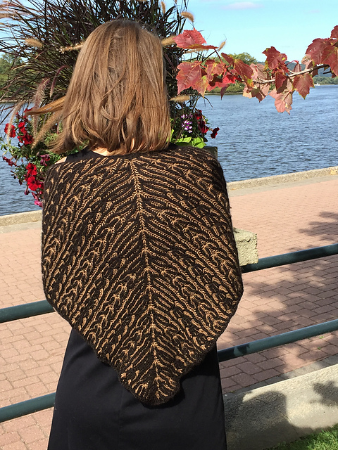 Brioche knitting is a slipped-stitch technique that results in a stretchy knitted fabric where the partially visible floats add interest to the fabric design. When worked in a rib pattern, as in the Reversible Brioche Wrap shown in the photos below, the fabric does not compress as much as traditional ribbing. But like a traditional rib pattern, the fabric doesn’t have an obvious right side or wrong side, which makes it an appealing stitch to use in scarves and wraps where both sides can be visible. In the photos below, the fawn-colored floats are visible on the side with the more prominent black knitted stitches. On the reverse side, the black-colored floats are visible with the more prominent fawn-colored knitted stitches.